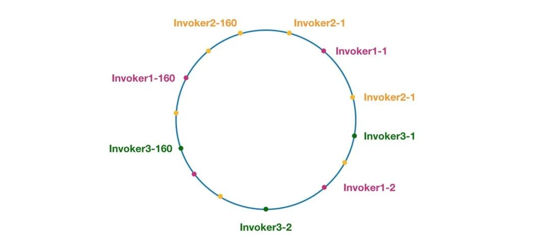 一致性hash:通过hash算法,把provider的invoke和随机节点生成hash,并将这个 hash 投射到 [0, 2^32 - 1] 的圆环上,查询的时候根据key进行md5然后进行hash,得到第一个节点的值大于等于当前hash的invoker。