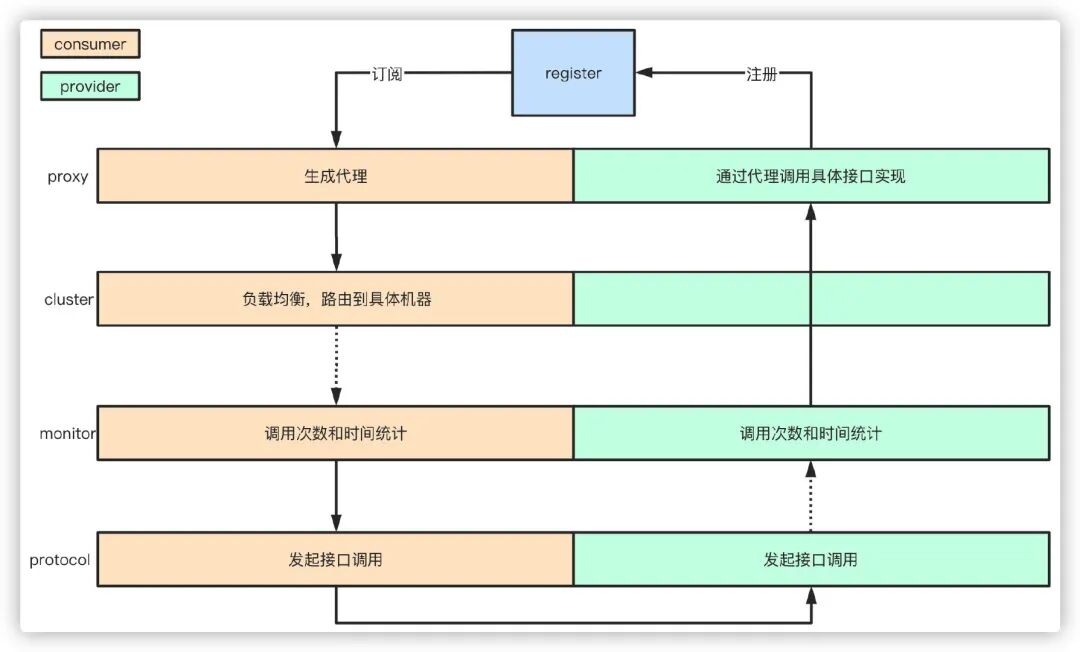 服务启动的时候,provider和consumer根据配置信息,连接到注册中心register,分别向注册中心注册和订阅服务