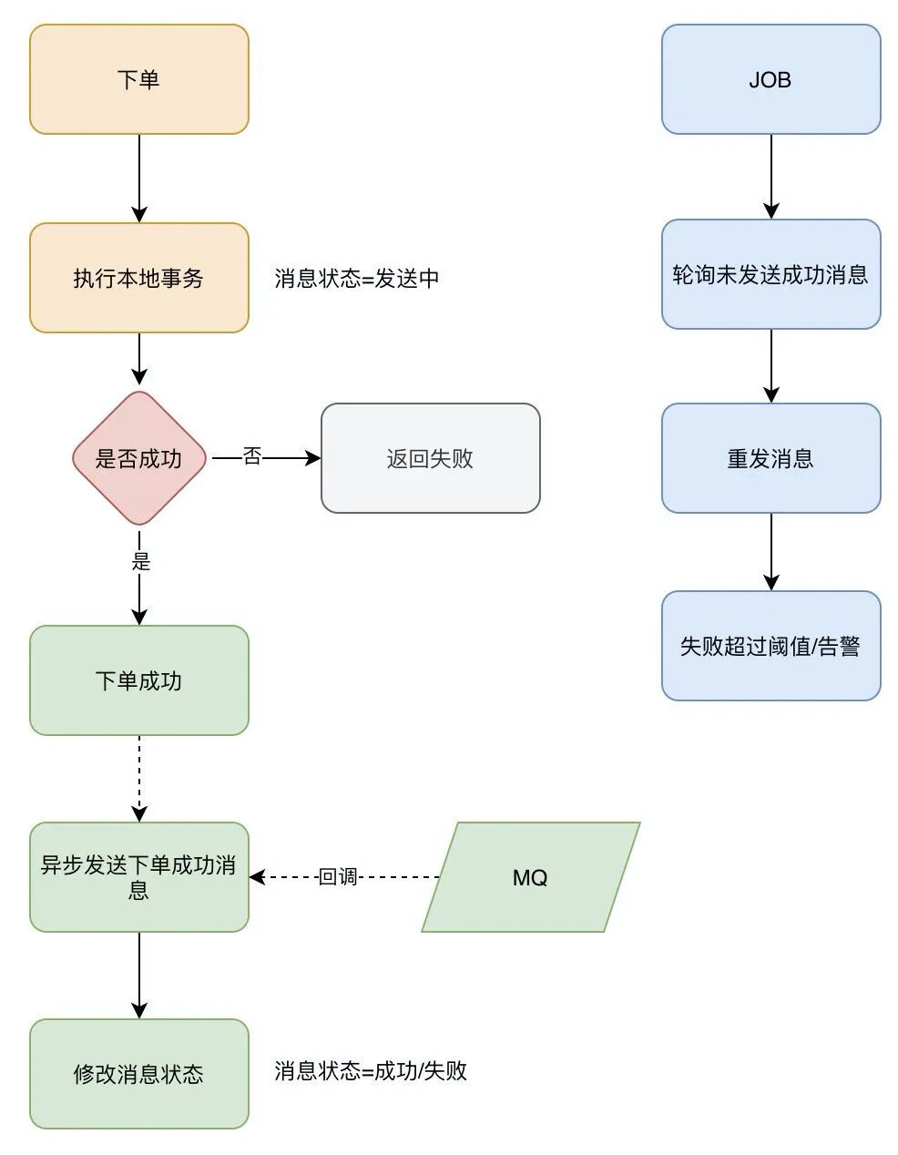 - JOB轮询超过一定时间(时间根据业务配置)还未发送成功的消息去重试