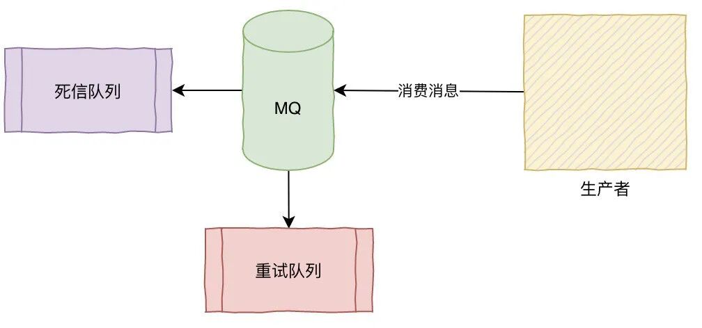 消费方不返回ack确认,重发的机制根据MQ类型的不同发送时间间隔、次数都不尽相同,如果重试超过次数之后会进入死信队列,需要手工来处理了。(Kafka没有这些)
