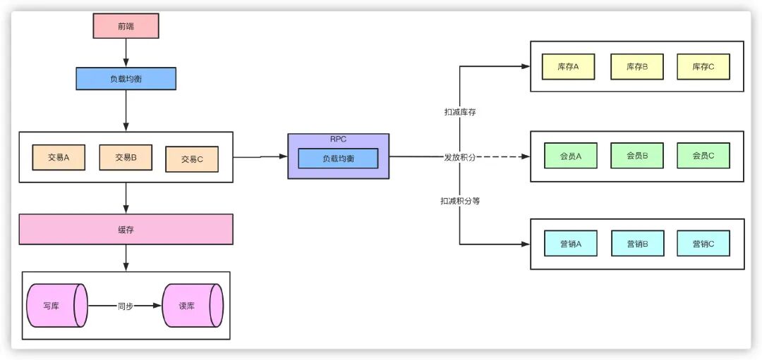 对于一些不需要同步执行的接口,可以通过引入消息队列的方式异步执行以提高接口响应时间。在交易完成之后需要扣库存,然后可能需要给会员发放积分,本质上,发积分的动作应该属于履约服务,对实时性的要求也不高,我们只要保证最终一致性也就是能履约成功就行了。对于这种同类性质的请求就可以走MQ异步,也就提高了系统抗压能力了。